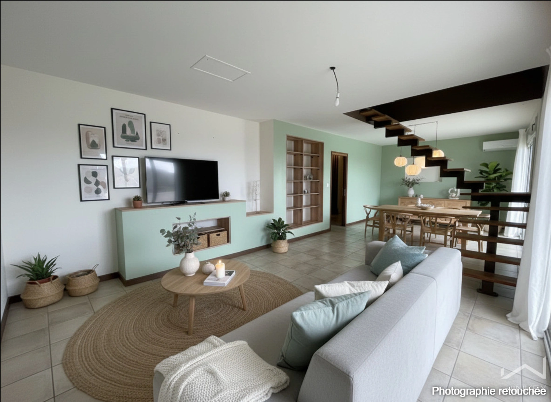 Une mezzanine complète l'ensemble et peut être aménagée en salle de jeux.