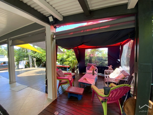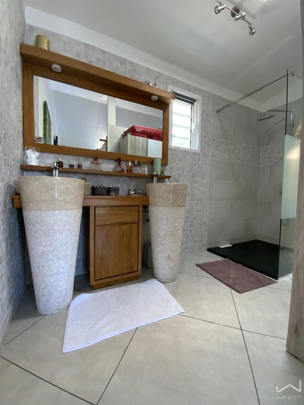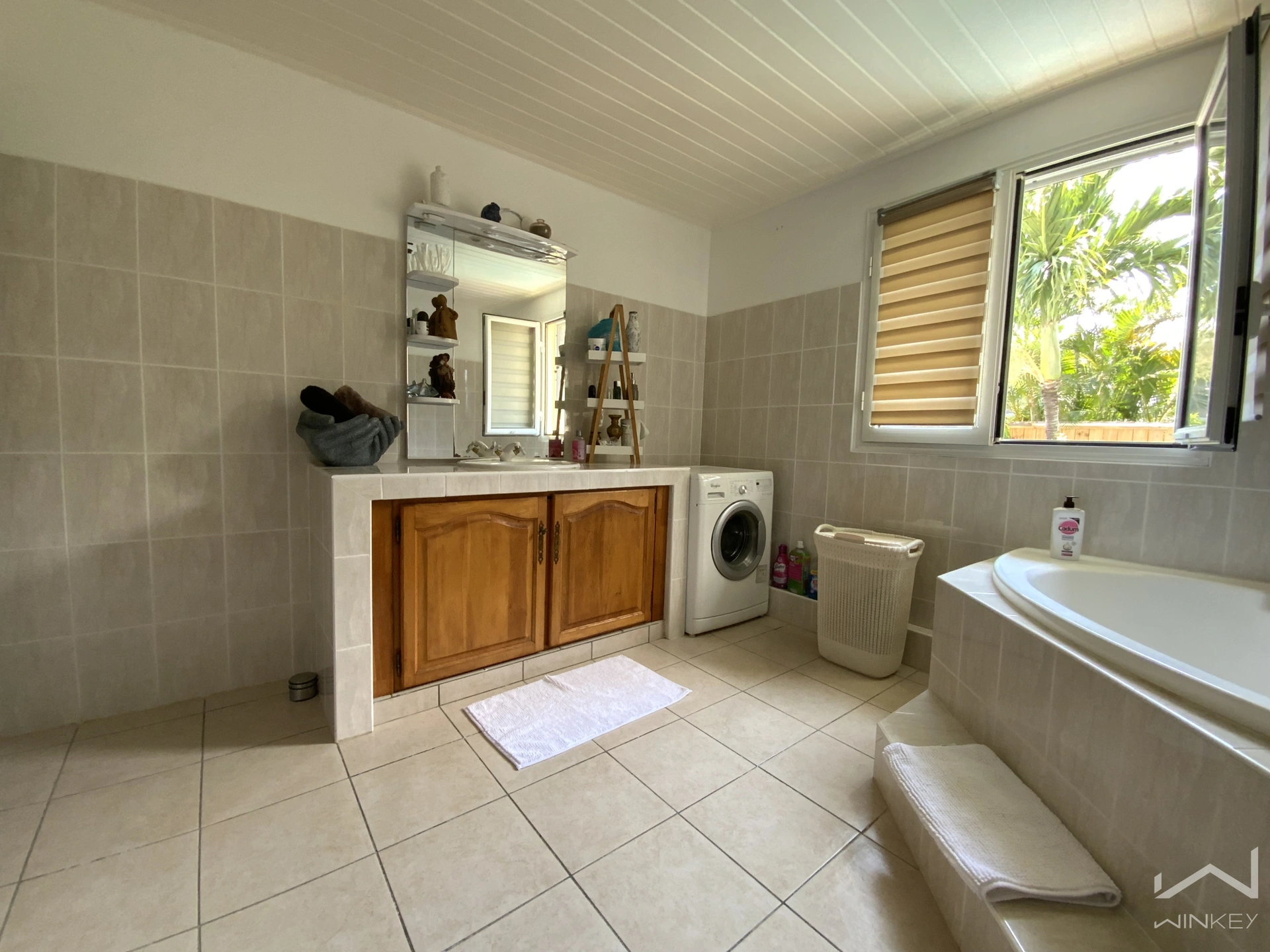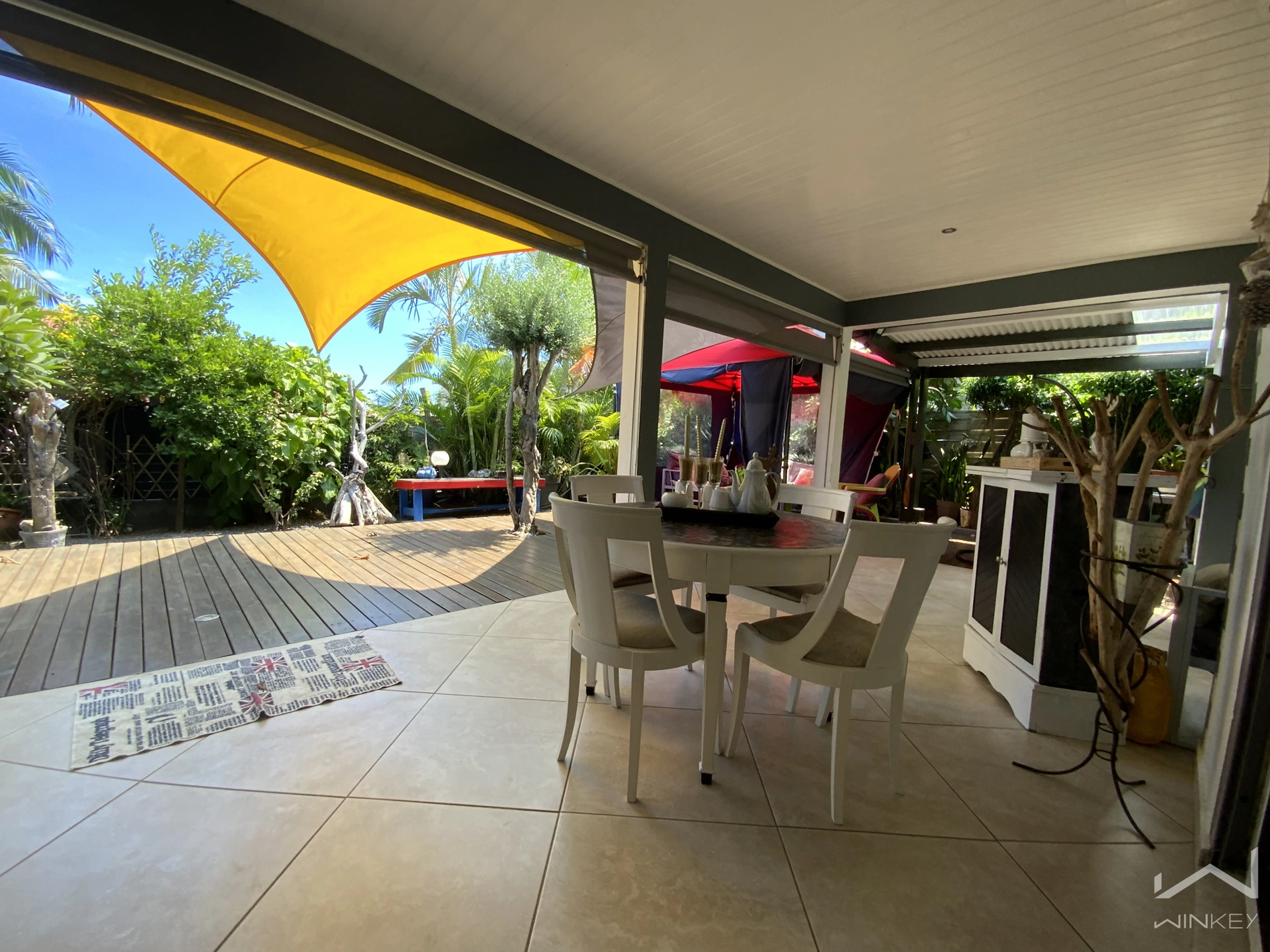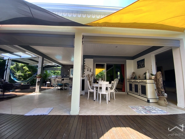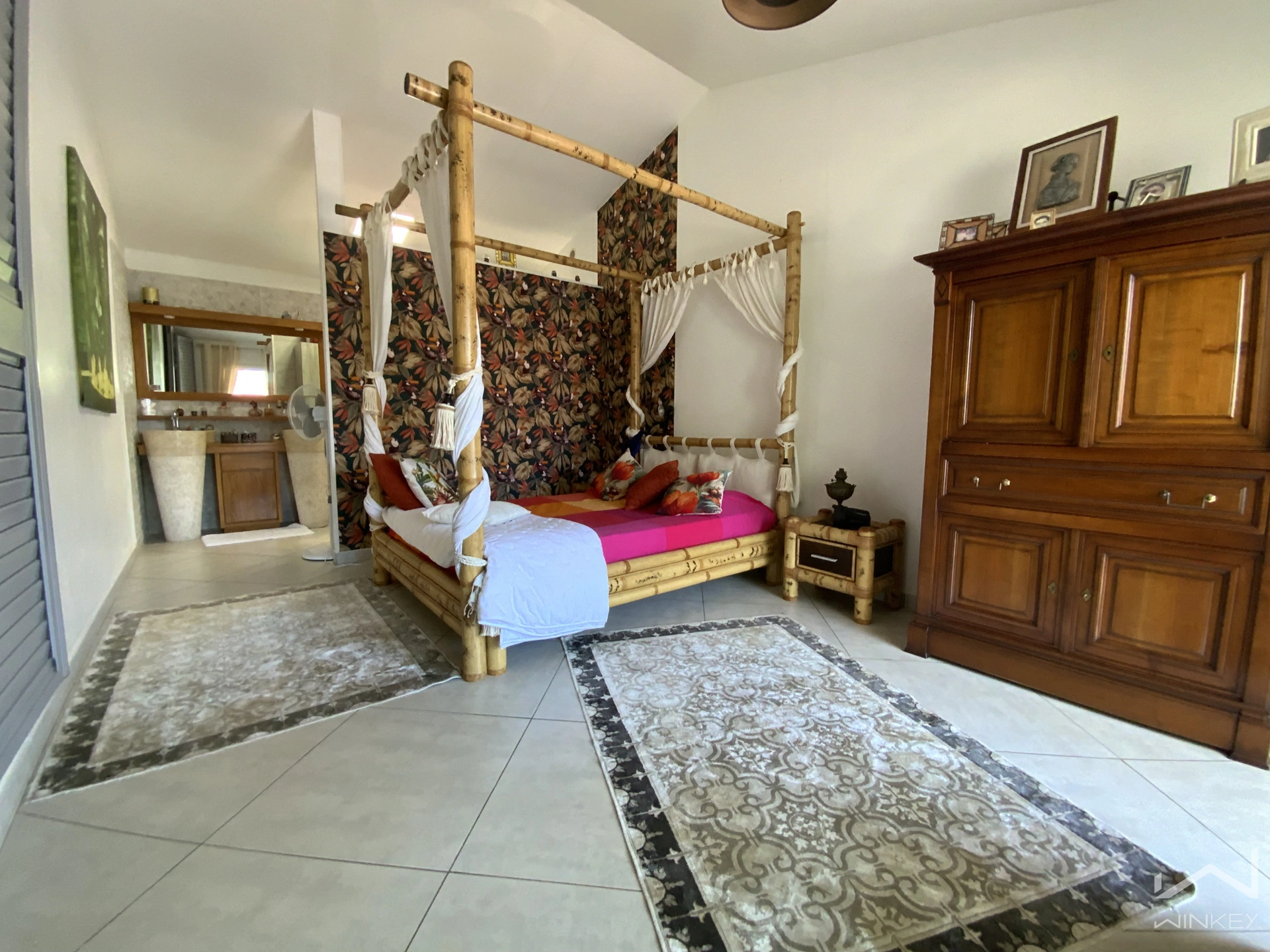 Au rez-de-chaussée, vous trouverez également une belle suite parentale de 23 m2 avec douche à l'italienne et entrée indépendante, une deuxième chambre, un toilette, une cuisine équipée et aménagée ainsi qu'un séjour et un salon très lumineux qui s'ouvrent sur une immense varangue qui peut être fermée  en cas de vent ou de pluie par un système de stores guidés en toile polyester microperforée.Vous permettant ainsi de profiter de ce magnifique espace en été comme en hiver.