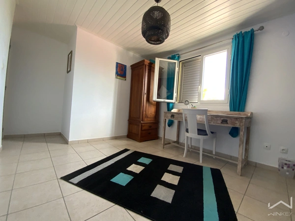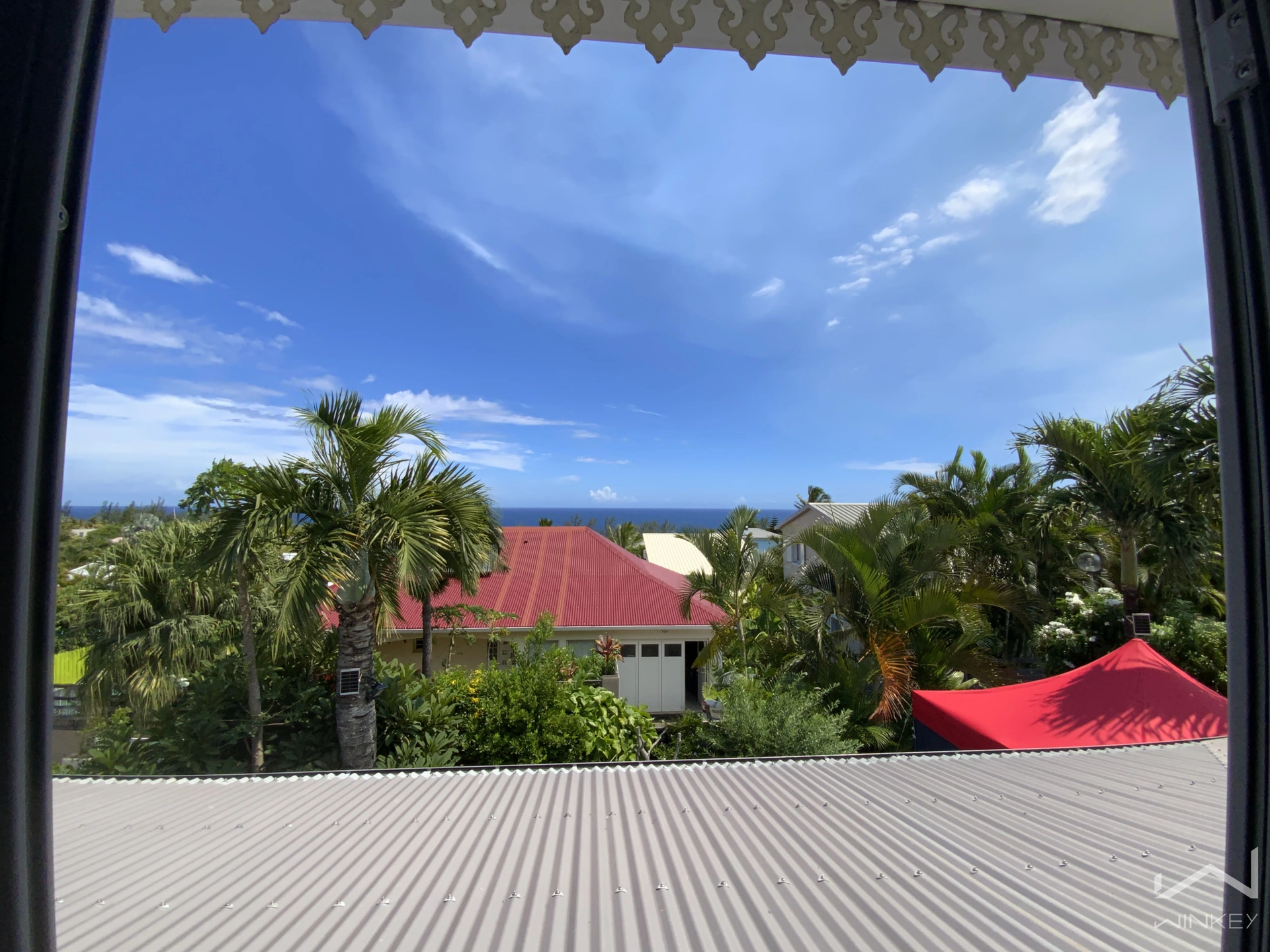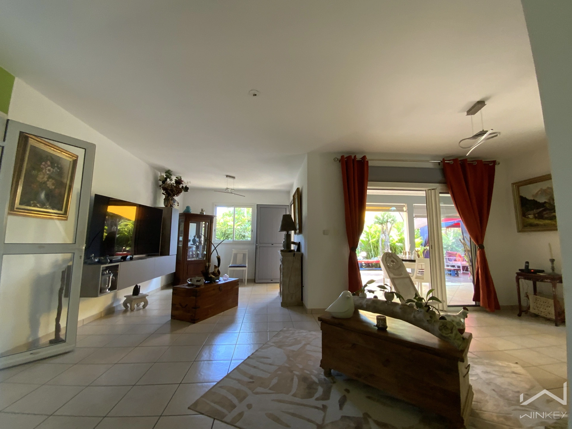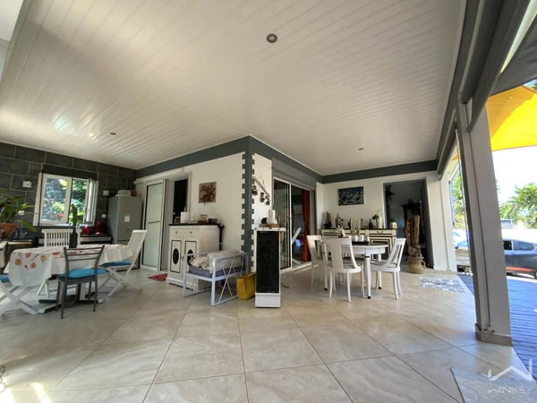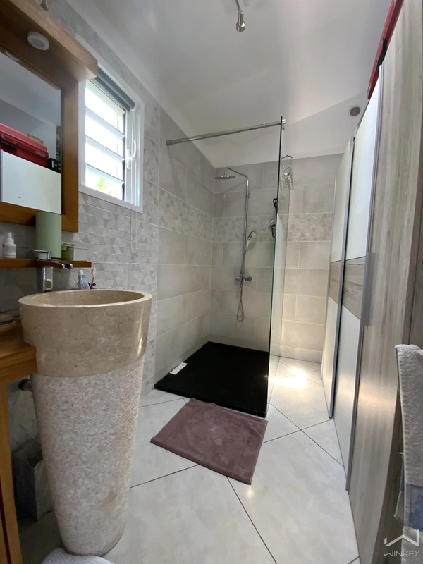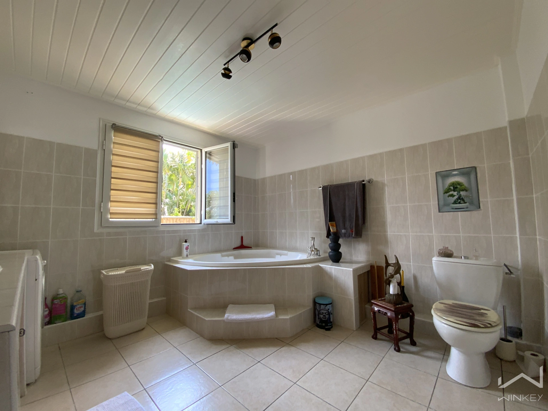 Au rez-de-chaussée, vous trouverez également une belle suite parentale de 23 m2 avec douche à l'italienne et entrée indépendante, une deuxième chambre, un toilette, une cuisine équipée et aménagée ainsi qu'un séjour et un salon très lumineux qui s'ouvrent sur une immense varangue qui peut être fermée  en cas de vent ou de pluie par un système de stores guidés en toile polyester microperforée.Vous permettant ainsi de profiter de ce magnifique espace en été comme en hiver.